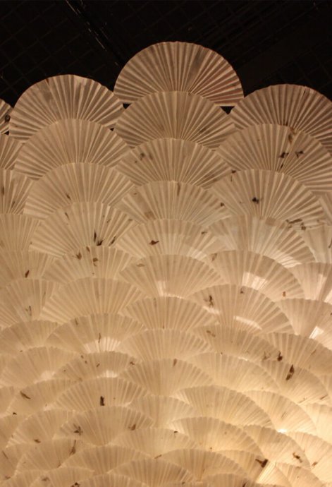 기둥 안 빈 공간의 LED 조명은 관람자가 종이부채의 겹쳐진 정도에 따라 다른 밝기를 느낄 수 있도록 한다.