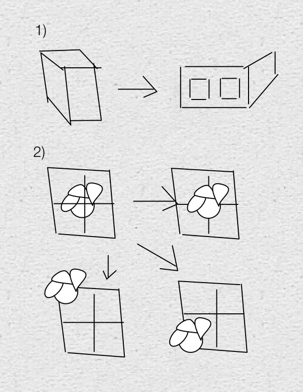 1) 을 보면 작가는 공간(건물)을 3차원에서 2차원적으로 표현했다. 이는 작품의 바탕이 되는 공간이기도 하다.