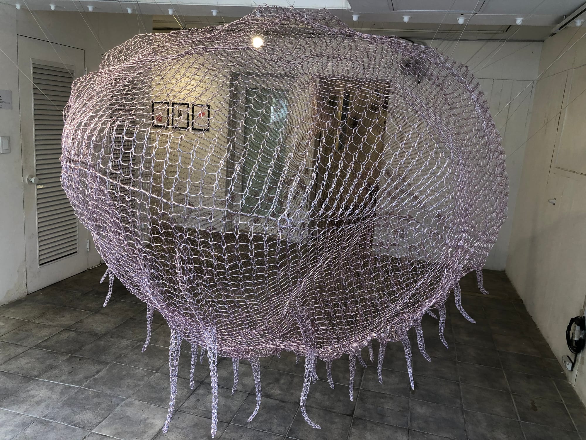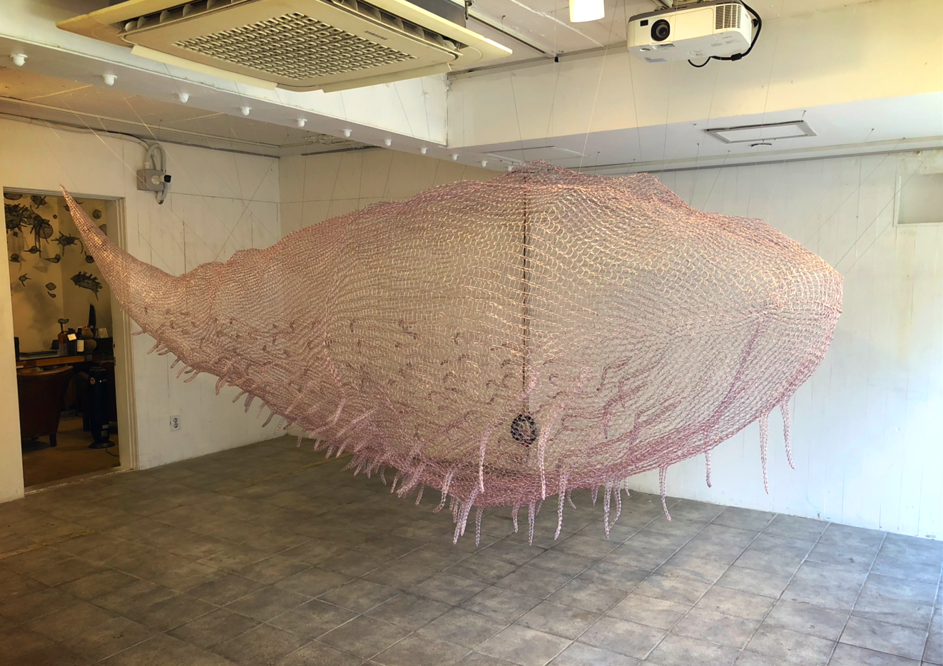 분홍 고래는 알루미늄 와이어를 한 가닥, 한 가닥 뜨개질 작업을 통해 완성된다.