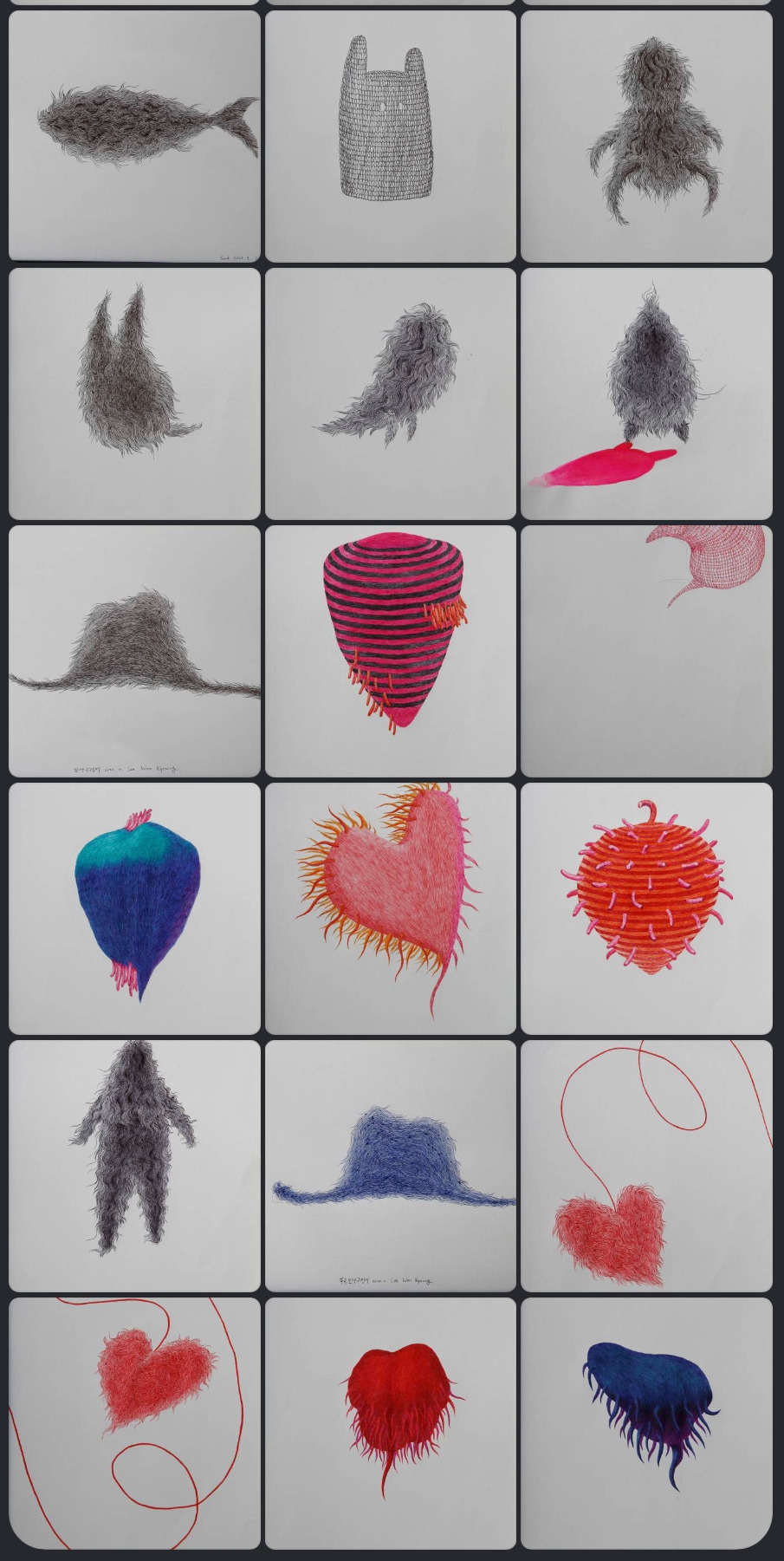 이 스케치는 '시드 시리즈'와 '비 하트 시리즈'라 부르는, 오랜 시간 자기만의 스타일을 창조했던 두 가지 시리즈의 작품을 펜화로 담았다.