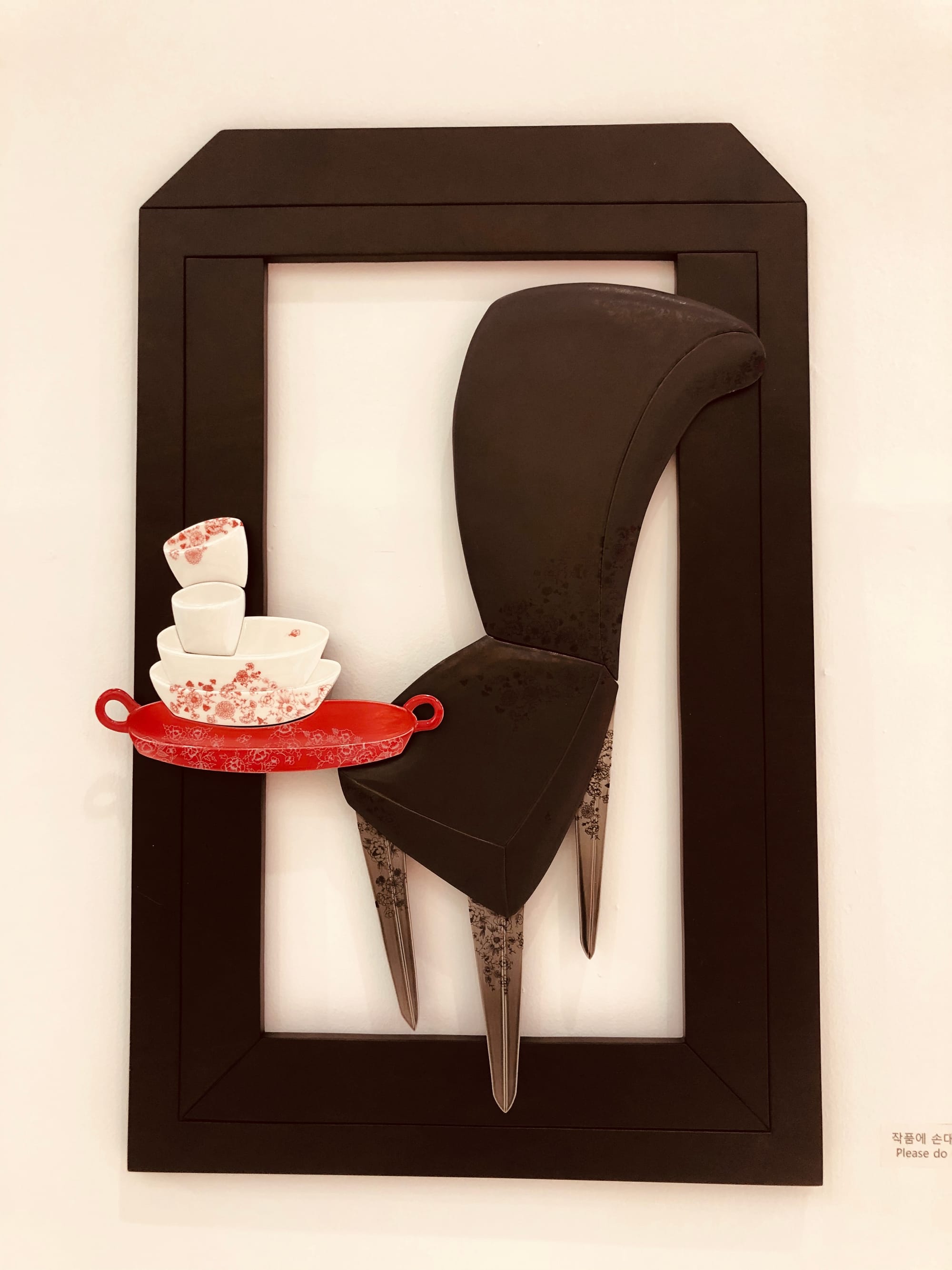 2)를 보면 작가가 실내의 사물을 공간 바깥으로 꺼내어 오브제 형태로 표현하였다. 이 오브제는 컵, 의자, 다기, 빗자루에 이르기는 생활 속 소품이다.