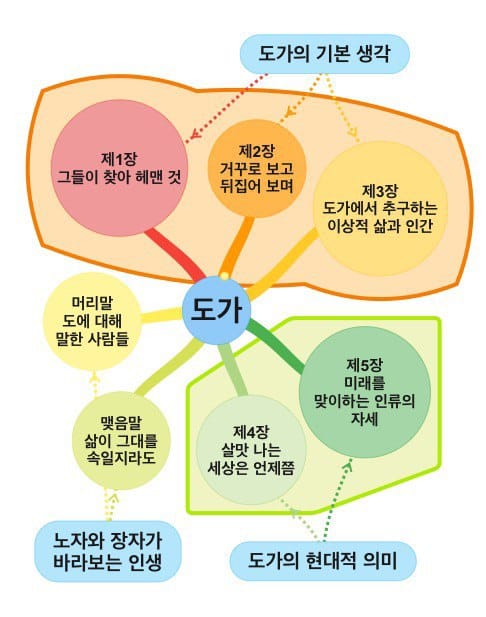 이 책은 노자와 장자의 생각을 다섯 가지로 정리하였다. 또한 현대사회의 문제와 연관지으려 노력했다. 노자와 장자의 생각에는 개인이 삶을 대하는 태도의 문제와 함께 사회, 정치, 환경 문제를 해결하기 위한 여러 접근법을 제시하였다. 아래 도표에 도가의 기본 생각을 담아보았다.